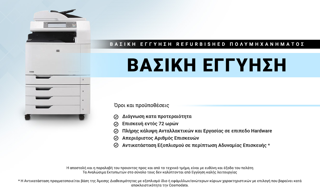 Μείνετε Ήσυχοι διότι η εταιρία μας δεσμεύεται προσωπικά να αντικαταστήσει άμεσα το πρόβλημα ή ακόμη και το προϊόν χωρίς καθυστερήσεις και χρονοβόρες διαδικασίες. Απλά Ενημερωτικά τα Refurbish που εμπορευόμαστε έχουν ποσοστό βλαβών 5 τοις Χιλίοις ( Προσπαθούμε να το εξαλείψουμε ) . Για την Cosmodata εδώ και 25 Χρόνια η εγγύηση και η εξυπηρέτηση μετά την πώληση είναι 1η μας προτεραιότητα.