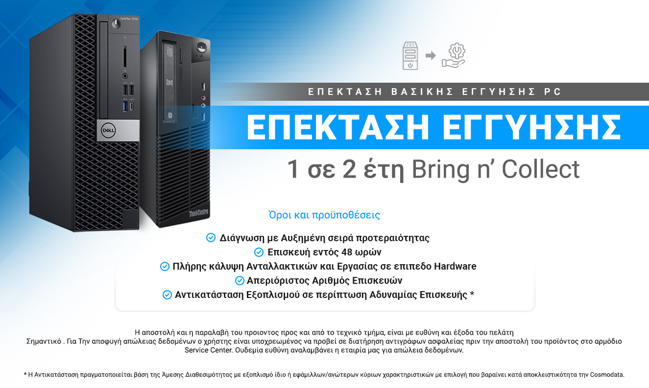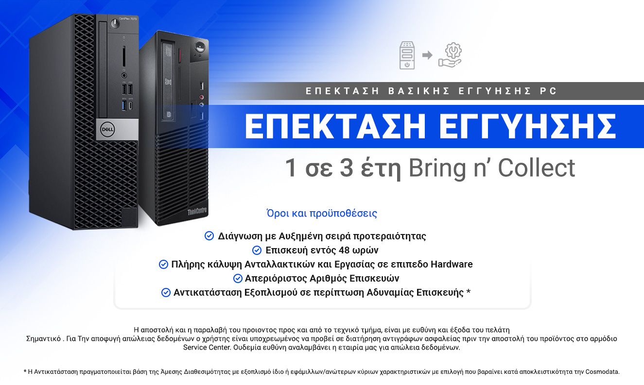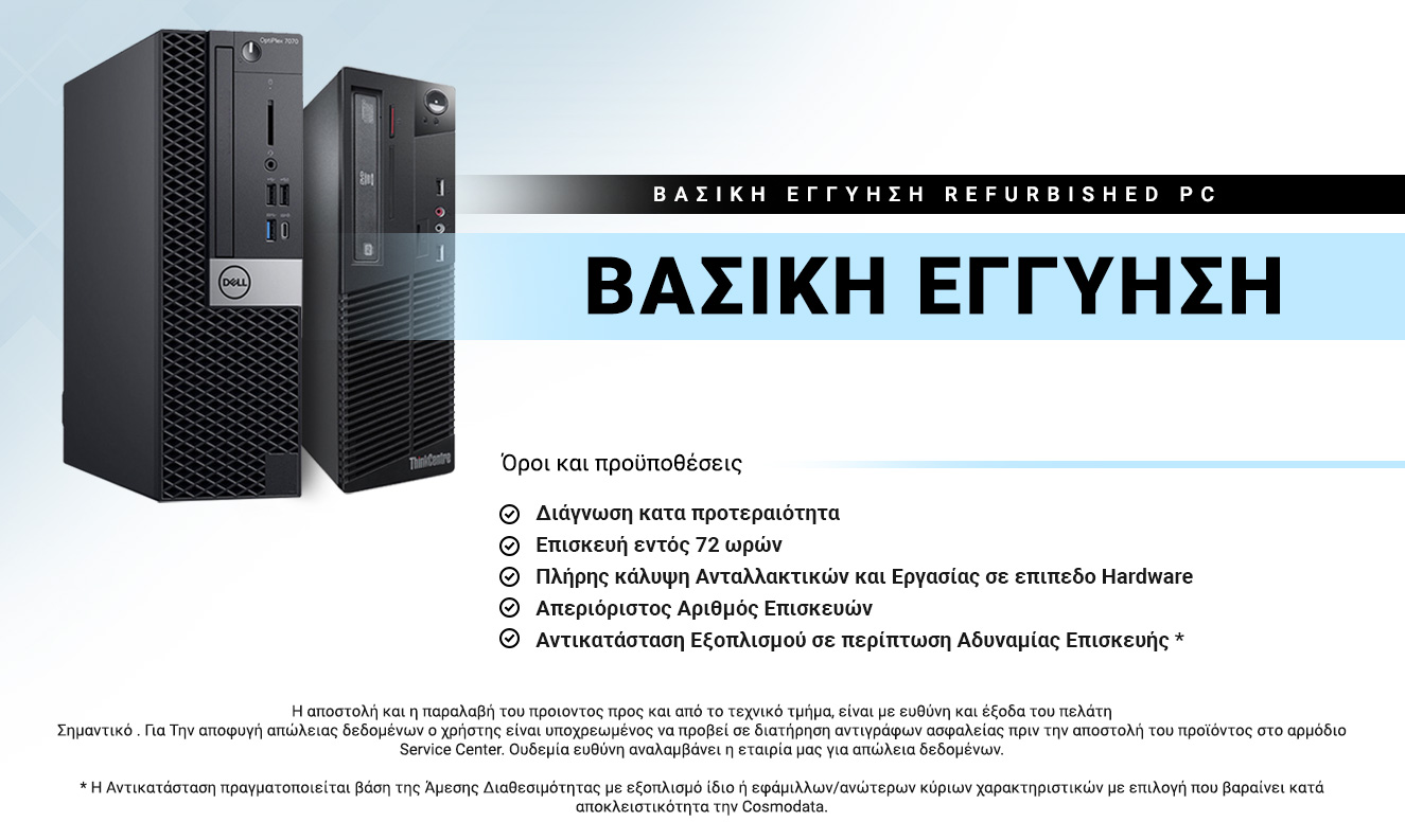 Μείνετε Ήσυχοι διότι η εταιρία μας δεσμεύεται προσωπικά να αντικαταστήσει άμεσα το πρόβλημα ή ακόμη και το προϊόν χωρίς καθυστερήσεις και χρονοβόρες διαδικασίες. Απλά Ενημερωτικά τα Refurbish που εμπορευόμαστε έχουν ποσοστό βλαβών 5 τοις Χιλίοις ( Προσπαθούμε να το εξαλείψουμε ) . Για την Cosmodata εδώ και 25 Χρόνια η εγγύηση και η εξυπηρέτηση μετά την πώληση είναι 1η μας προτεραιότητα.