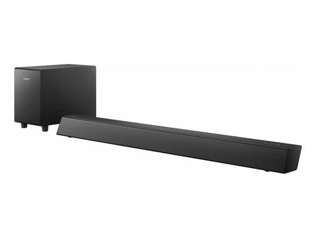 Soundbar TAB5305 της εταιρείας Philips. Ανήκει στην κατηγορία των 2.1 soundbars, δηλαδή διαθέτει 2 μεγάφωνα υπεύθυνα για την απόδοση των ψηλών και μεσαίων ηχητικών συχνοτήτων και 1 μεγάφωνο ή ξεχωριστό ηχείο (woofer) για τις χαμηλές. Στην προκειμένη περίπτωση, διαθέτει subwoofer το οποίο μπορεί να συνδεθεί ασύρματα, άρα μπορείτε να το τοποθετήσετε οπουδήποτε στον χώρο σας χωρίς να σας προβληματίζουν τα καλώδια.