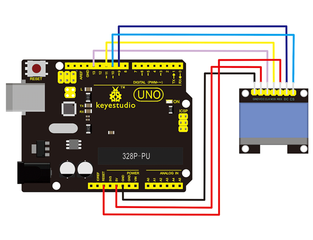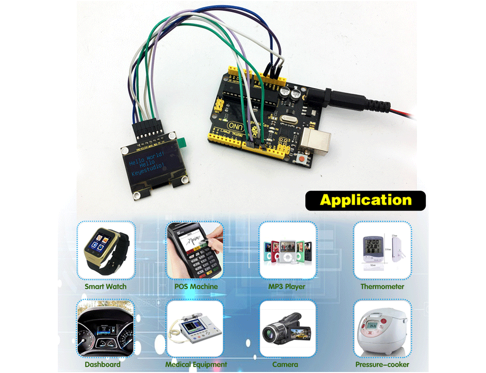 OLED graphic display module της Keyestudio. Είναι μια οθόνη με τεχνολογία OLED που χρησιμοποιεί μόνο ηλεκτρική ενέργεια ανά pixel γεγονός που την καθιστά πολύ αποτελεσματική. Συμβατή με Arduino UNO R3.