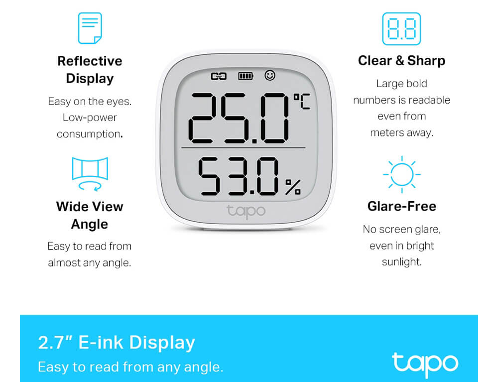 - Οθόνη 2,7" E-ink - Υποδεικνύει τη θερμοκρασία και την υγρασία, το επίπεδο άνεσης με εκφράσεις του προσώπου, την κατάσταση της μπαταρίας και το σήμα.