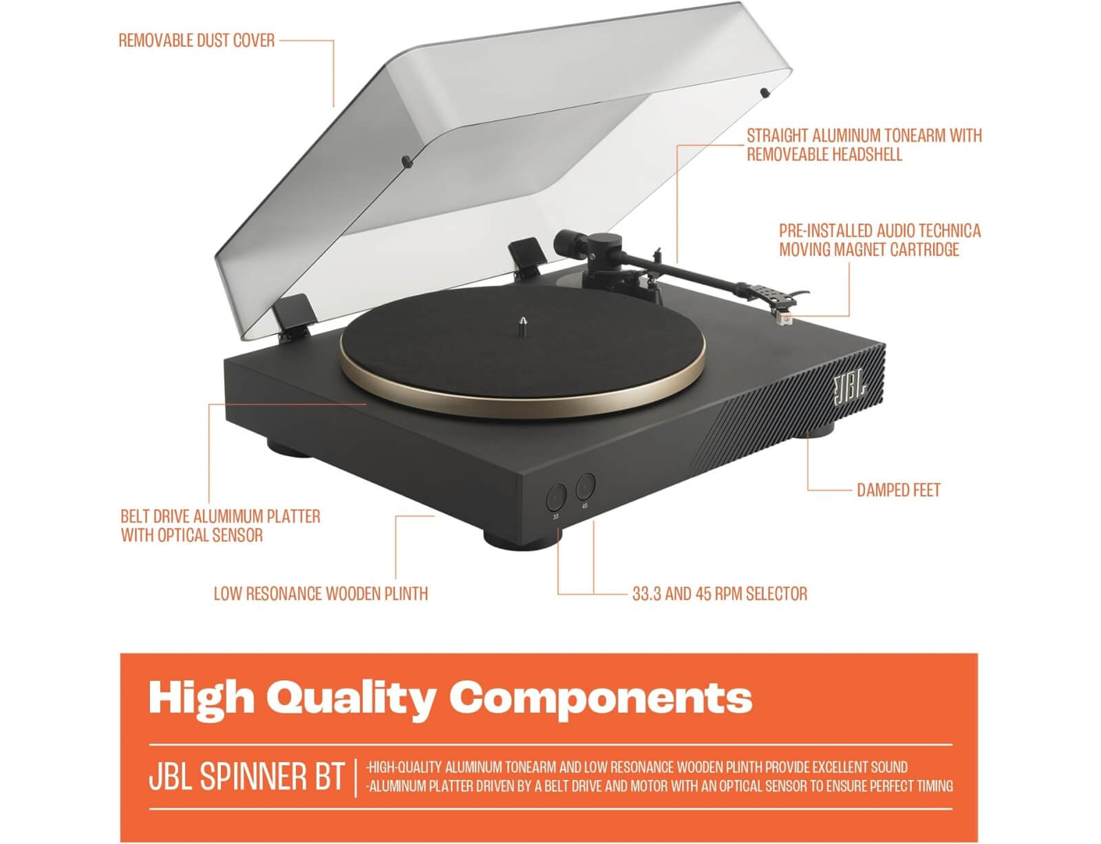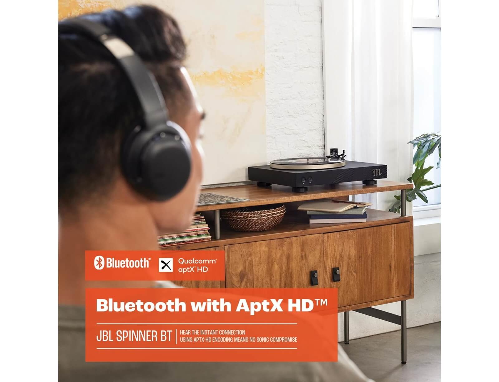 Παίξτε άμεσα τη συλλογή δίσκων σας με οποιοδήποτε ηχείο ή Bluetooth ακουστικά. Χρησιμοποιώντας aptX™ HD encoding, δεν υπάρχει συμβιβασμός στον ήχο. Ο ήχος από τους δίσκους σας είναι τόσο καλός όσο και μέσω καλωδίων.  Το JBL Spinner BT περιλαμβάνει αναλογικές εξόδους για υπάρχοντα συστήματα Hi-Fi, με ενσωματωμένο phono pre-amp για χρήση με ενεργά ηχεία. Χρησιμοποιώντας πλάκα αλουμινίου και βραχίονα, το JBL Spinner BT είναι απόδειξη της ευτυχίας που μας δίνει η μουσική και οι δίσκοι βινυλίου.