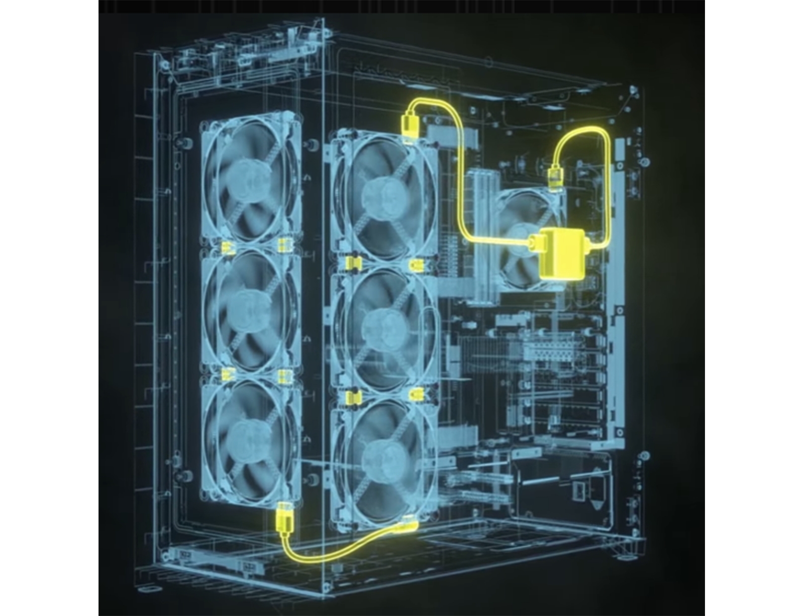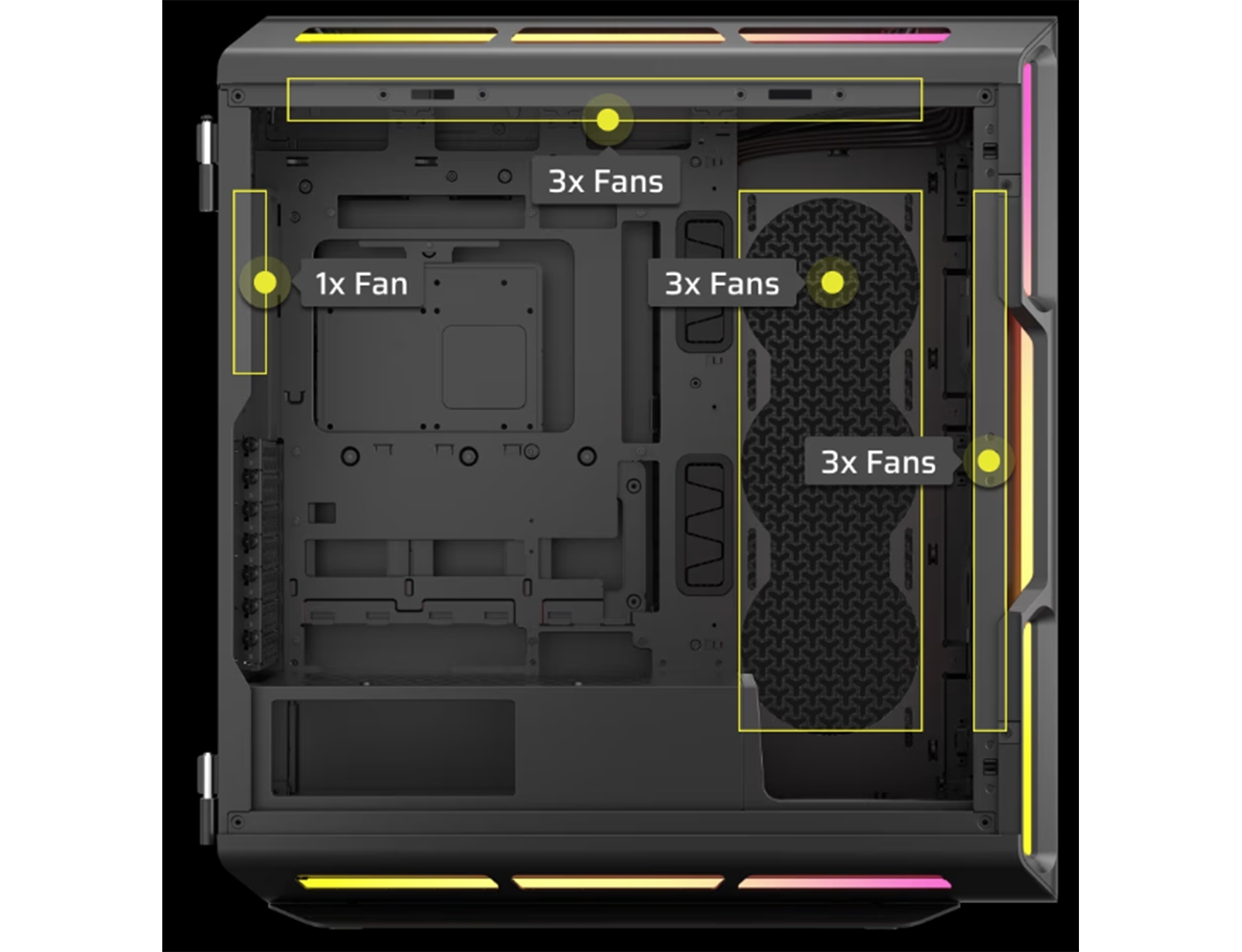Το ευρύχωρο εσωτερικό μπορεί να φιλοξενήσει έως και 10 ανεμιστήρες ψύξης 120 mm ή 4 ανεμιστήρες 140 mm, καθώς και πολλαπλά θερμαντικά σώματα πάχους 60 mm, συμπεριλαμβανομένου ενός έως 360 mm μπροστά ή στο πλάι και ενός 360 mm με δυνατότητα ώθησης/έλξης στην οροφή.