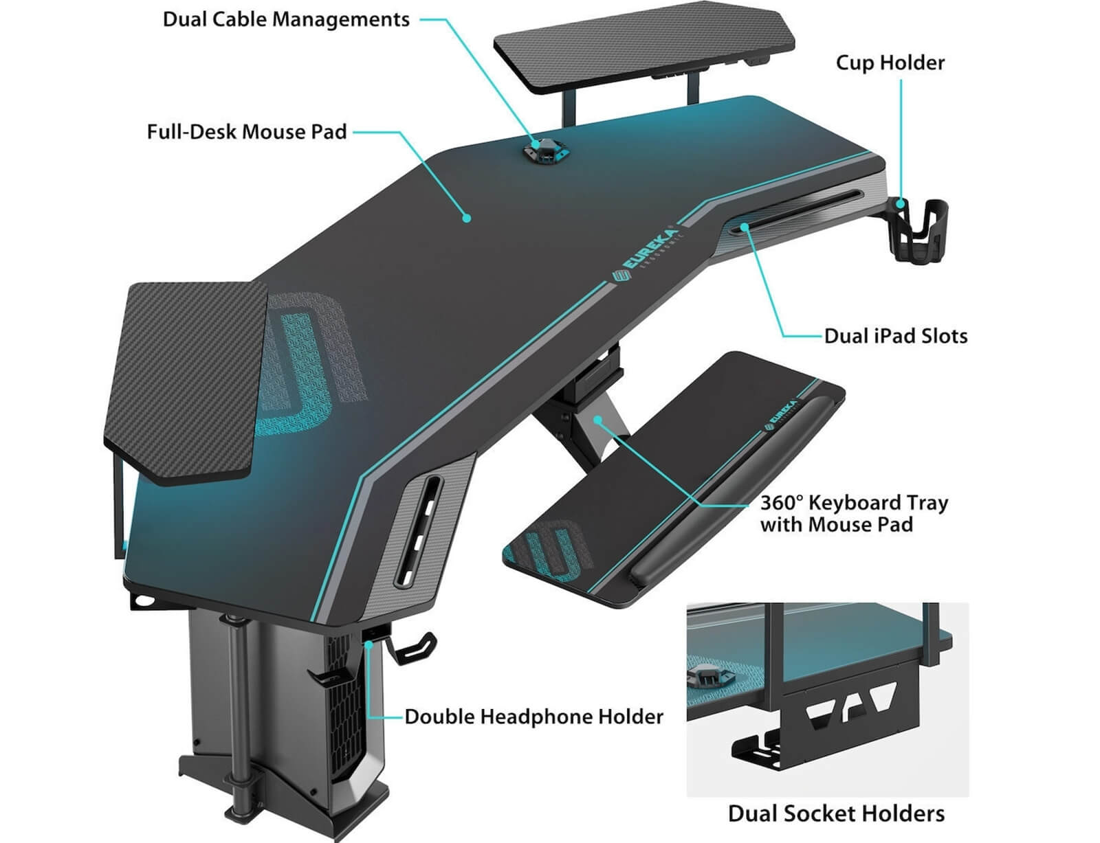 - Συνοδεύεται προέκταση του πληκτρολογίου, δύο ανυψωτές οθόνης, υποδοχές φορητών συσκευών, γάντζος ακουστικών και ποτηροθήκη
